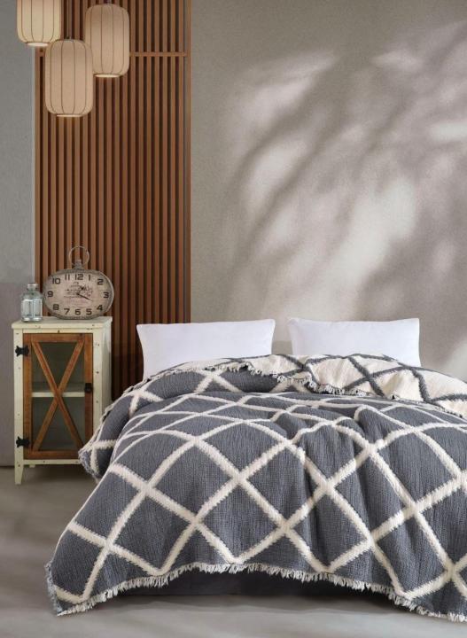 Завдяки великому розміру 230×250 см плед ідеально підходить як покривало на ліжко або диван. Двосторонній дизайн з різною інтенсивністю відтінків дозволяє змінювати вигляд спальні чи вітальні без додаткового текстилю. Лаконічна текстура та натуральна палітра гармонійно вписуються в сучасні інтер’єри — від мінімалізму до скандинавського стилю.