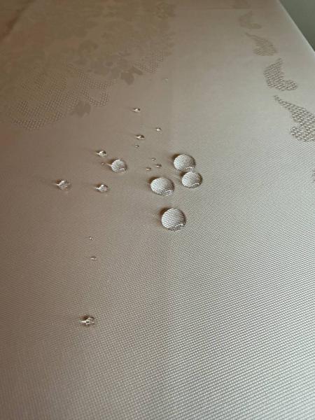 Скатертина з тефлоновим покриттям. Не поглинає вологу та відштовхує бруд. З цією скатертиною ви більше не хвилюватиметесь через випадково розлитий напій, адже будь-які плями можна промокнути серветкою і нічого не залишиться.